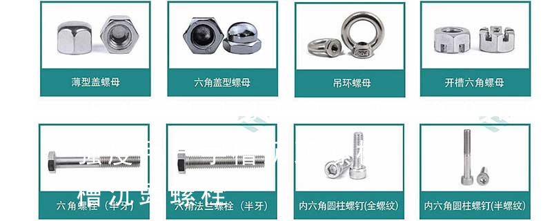 螺栓有:1、方頭螺栓,2、半圓頭方頸螺栓,3、十字槽盤頭螺釘,4、內六角沉頭螺釘,5、方螺母C級,6、蝶形螺母,7、六角頭螺栓,8、十字槽盤頭自攻螺釘。大小有M18、M6、M8、M16、M10、M12、M14、M20等型號。通常用
