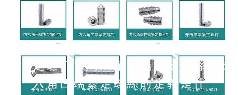 內六角凹端緊定螺釘GB/T 80-2000 方頭長圓柱球面端緊定螺釘GB 83-88 方頭凹端緊釘螺釘GB 84-88 方頭長圓柱端緊定螺釘GB 85-88 方頭短圓柱錐端緊定螺釘 GB 86-88 十字槽盤頭螺釘GB/T 818-2000 六角頭不脫出 不銹鋼螺絲產品主要有:外六角螺栓、圓柱頭內六角螺釘(杯頭)、內六角凹端緊定螺釘(凹端機米)、內六角平端緊定螺釘(平端機米)、內六角尖端緊定螺釘(尖端機米)、內六角柱端緊定螺釘(柱端機米)、沉頭內六角螺釘(平杯)